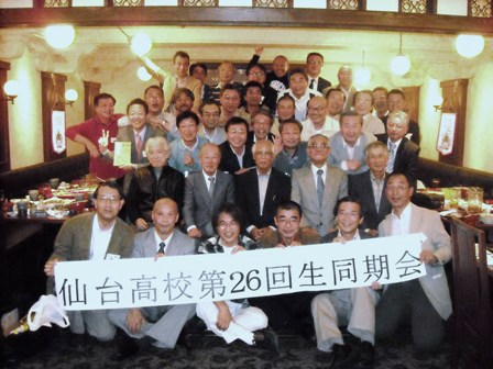 第26回(昭和49年3月卒)同期の懇親会を平成22年9月25日に「仙台ライオン一番町店」(C組北目淳一さんの店)にて開催致しました。C組担任の吉岡一男(日本史 高校4回卒)、初参加でF組担任の加藤豊(数学 高校3回卒)、G組担任の和田清(数学)、H組担任の橋本敏(数学)、初参加の我妻則義(物理)の5名の先生方をお迎えし、生徒会長の真山隆道さん他3名の初参加の同期生を含め合計39名が集まりました。皆様、会場に到着早々に今年は誰が出席しているか確認して、初参加者を見て「おう来た〜、待っていました〜」と顔をほころばせ36年ぶりの再会を喜んでおりました。アットホームな雰囲気が好評で、飲食前からそちらこちらで話しがはずみ盛り上がっておりました。最後は、応援団員のC組堀江聡さんの音頭で、円陣を組み「校歌」の大合唱。85歳とは思えぬパワフルな我妻先生がエールを披露され、同期会を終始仕切っておられました。来年も健康で再会することを誓い合いお開きとなりました。来年の同期会はお盆の時期の平成23年8月13日土曜日19時から同店にて開催予定です。吉岡先生より今年自費出版された「仙臺鹿の子」(元禄八年1695年頃に仙台城下の内容を記述した書物)を参加者全員に頂戴致しました。吉岡先生にお礼申し上げます。